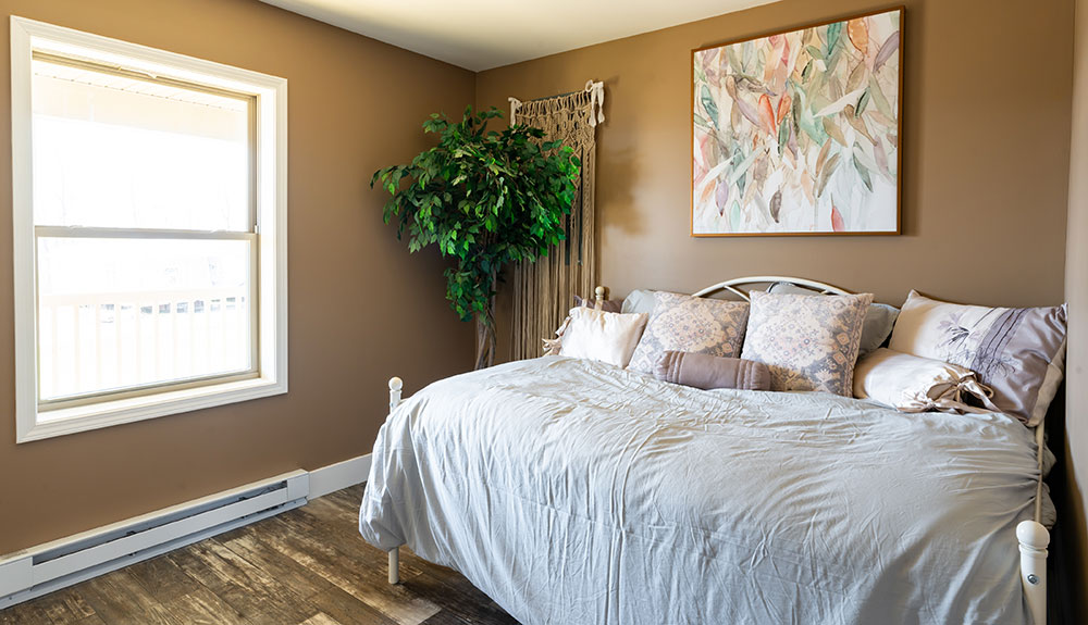 This cozy 2 bedroom “cabin in the woods” is a great example of the customization possibilities in a modular home. A little over 700 sq ft, this 2 bedroom 1 bathroom home has 2 factory built porches. Rest and relaxation awaits you in this open living space.